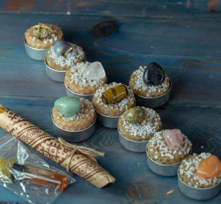 - А к заказам на сумму от 6500 рублей добавим ещё чудесный набор заговорённых громничных свечей с камнями-самоцветами «9 озёр. Чистота и Сила Громницы»! Это восковые свечи с камнями Стихий, девять разных камней. Свечи и камни также заговорены союзной силой.