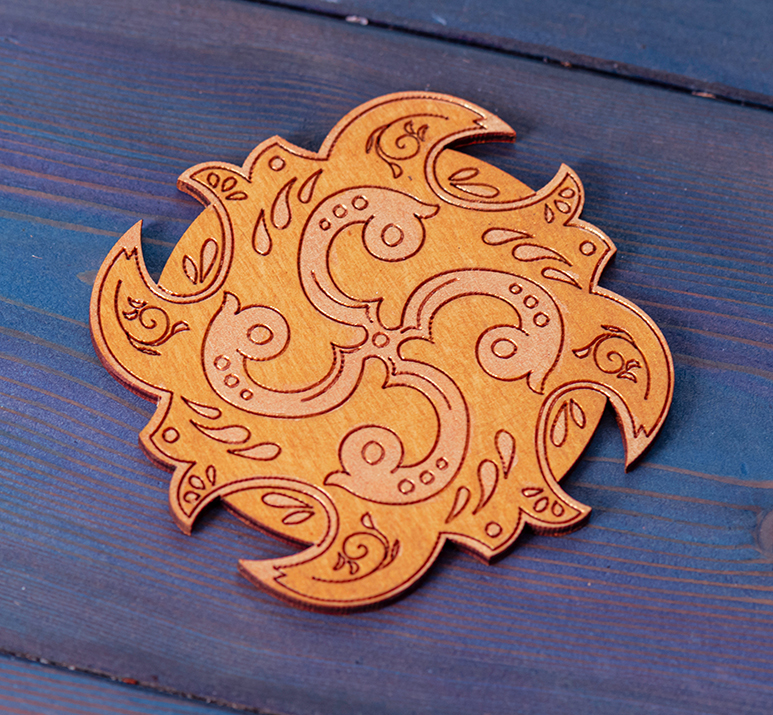 Деревянный фигурно вырезанный мини-алтарь с лазерной гравировкой и художественной стилизацией Знака Сваор — символа Бога Рода.