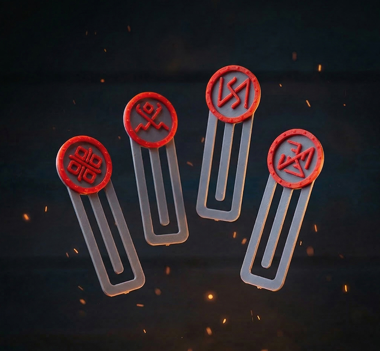 Закладки выполнены из полилактида — это самый популярный, экологически чистый и простой в использовании материал для 3D-печати, получаемый из кукурузы или сахарного тростника. Он биоразлагаем, нетоксичен, приятно пахнет при печати (попкорном). Отличается низкой температурой плавления, жёсткостью, глянцевой поверхностью, но хрупок и не любит температур выше 60°С, лучше под прямыми солнечными лучами его не оставлять. Не наносит вреда Природе, в открытых условиях будет активно биоразлагаться.