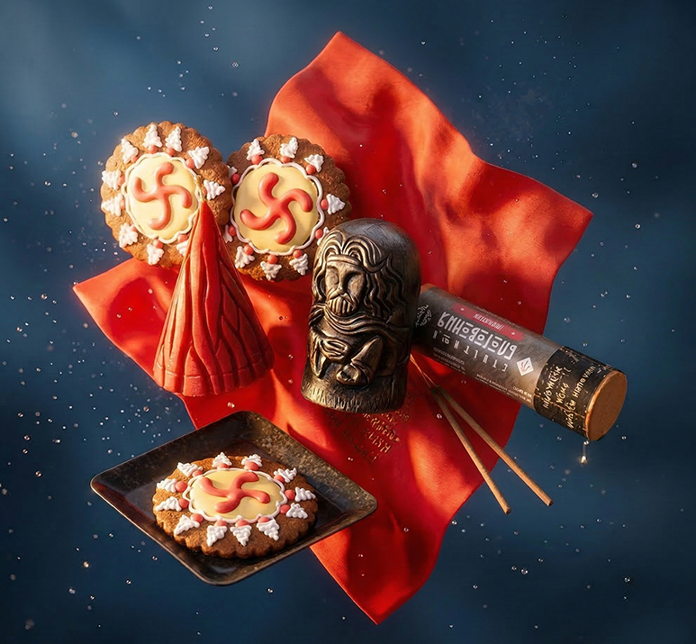 - Три традиционных праздничных обрядовых пряника, долгого хранения с ручной росписью в виде Резы Яровик, знака Бога Ярило. Предназначение: не для еды, а для верчи-дара Богу Ярило и Предкам. Из особого традиционного теста, без консервантов, только мука, мёд, корица, яйцо, соль.