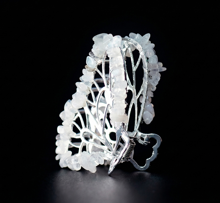 Чудесная заколка для волос создана Мастером в форме бабочки - прекрасного природного создания, символа лёгкости, красоты и очарования. Заколка имеет механизм краб, который прочно и бережно удерживает волосы в практически любой прическе. Крылья бабочки украшены природными камнями Стихии Воздуха, небольшими и не тяжелыми, чтобы её удобно было носить.